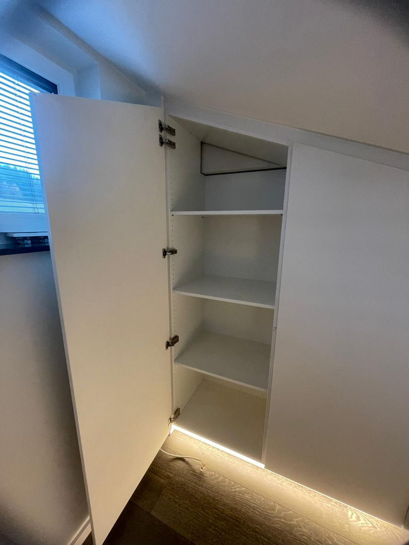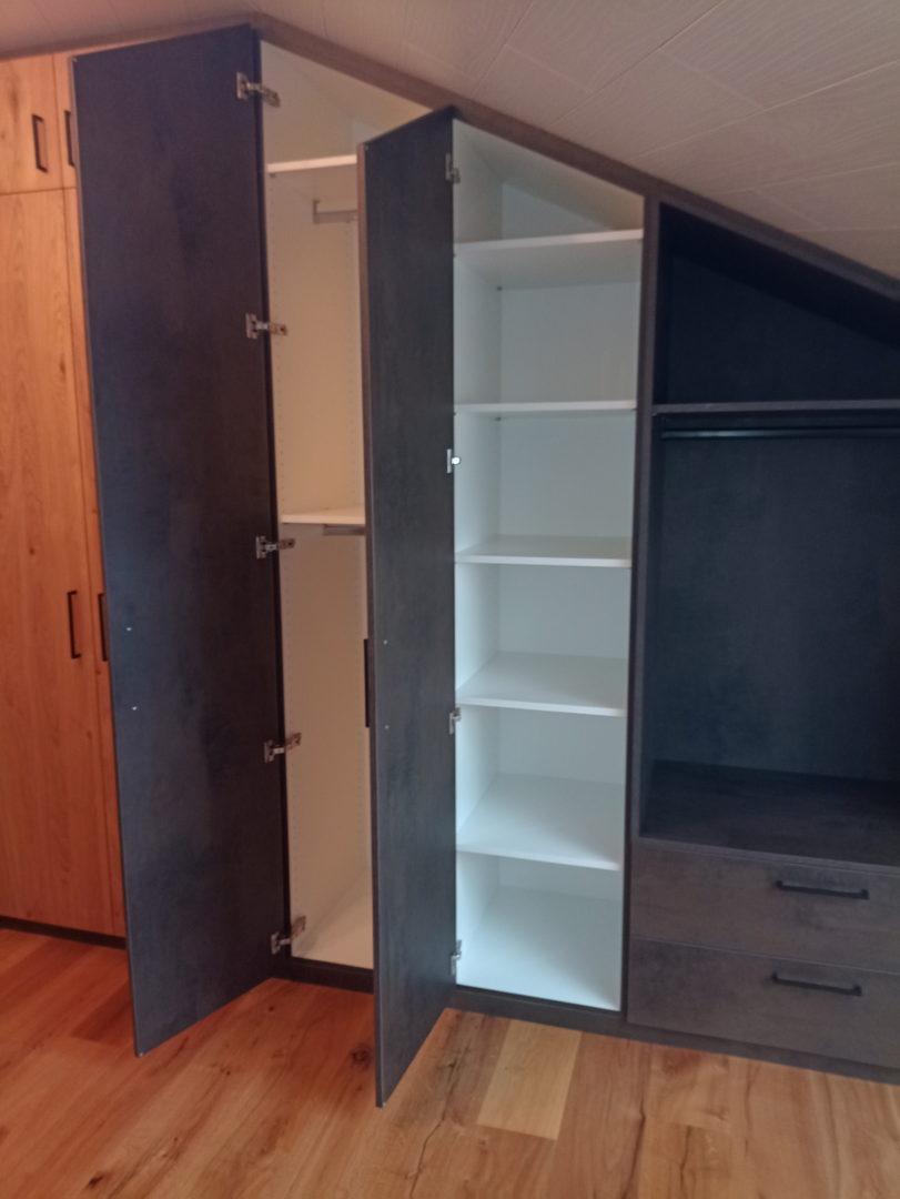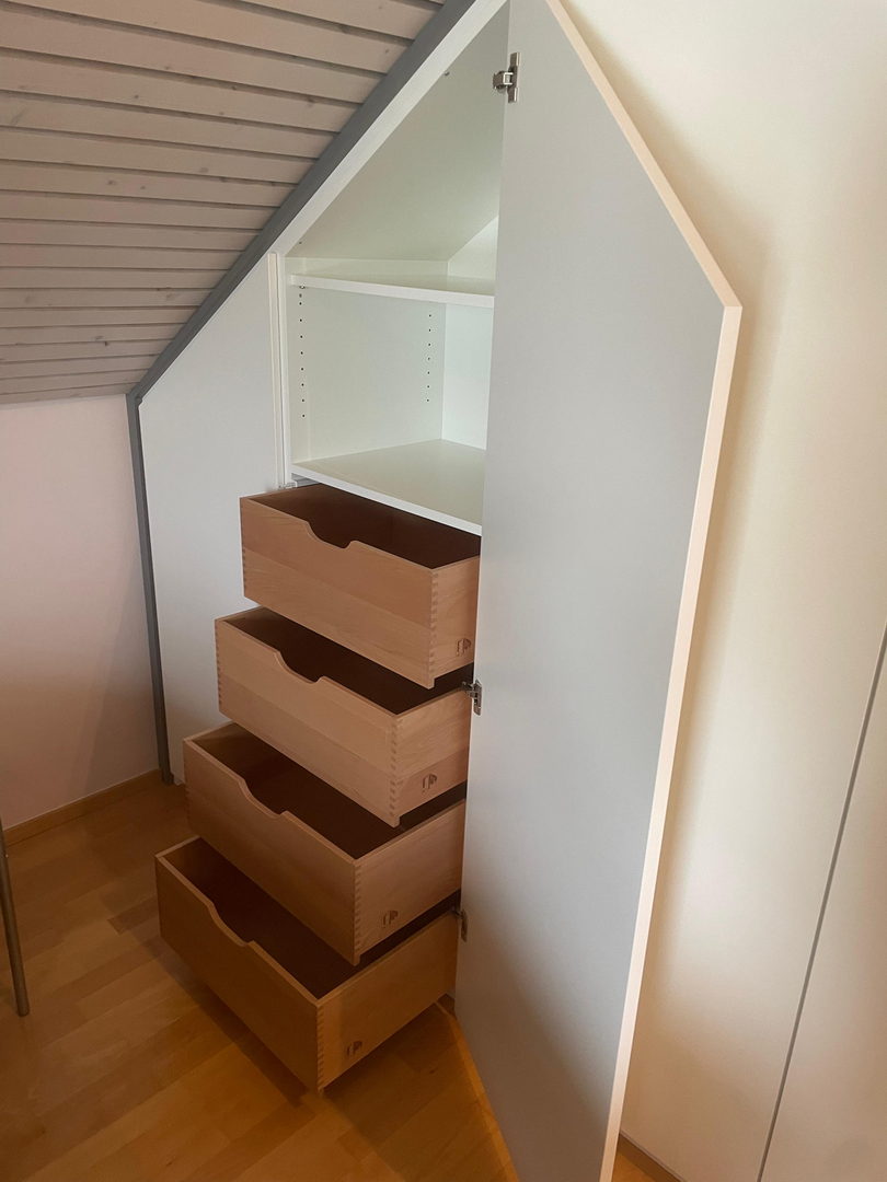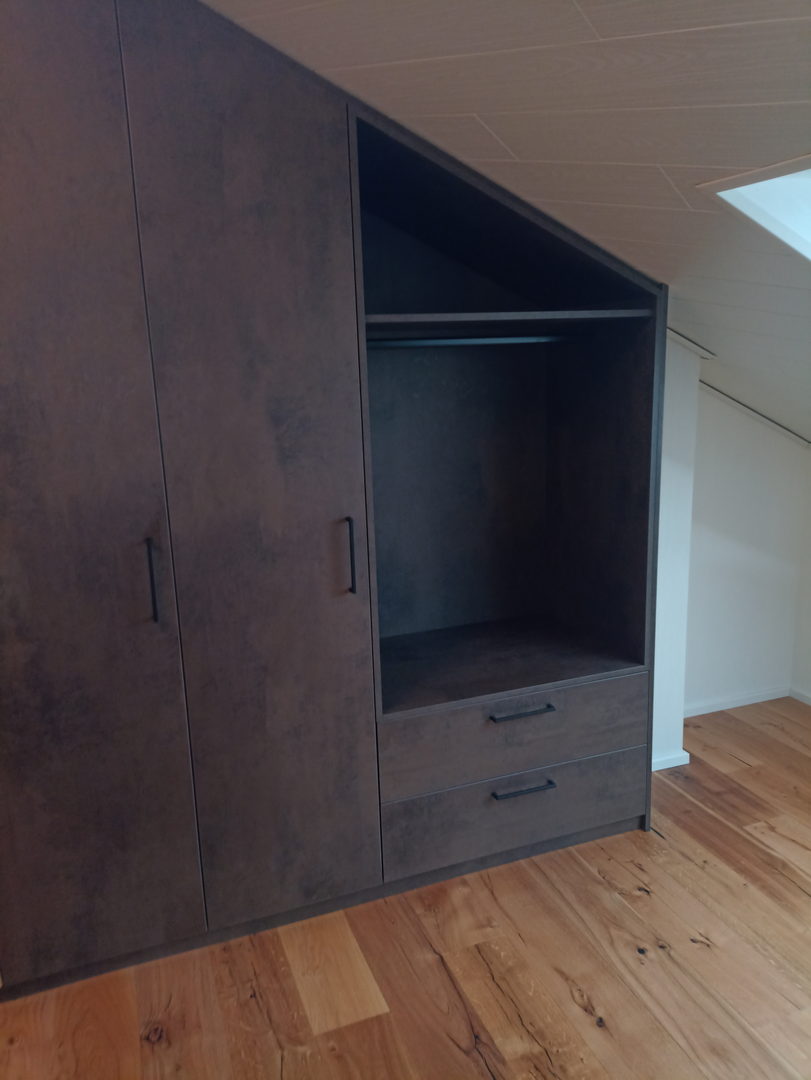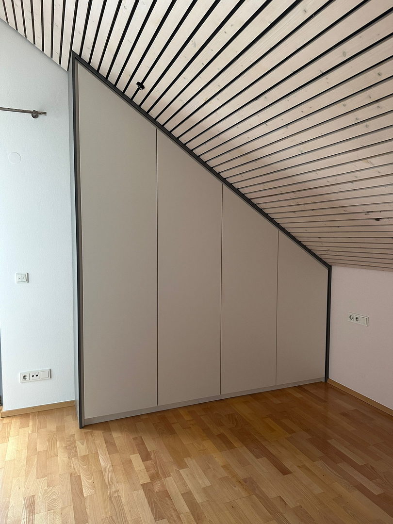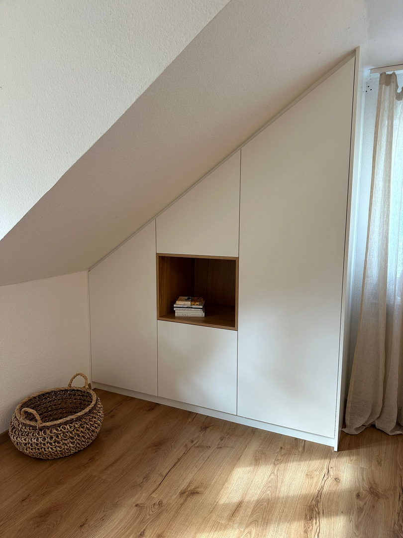 Unsere Dachschrägenschränke nach Maß bieten vielfältige Nutzungsmöglichkeiten: als Kleiderschrank mit Kleiderstangen und Schubladen, als Stauraumlösung für Schuhe und Koffer oder als geschlossener Einbauschrank für Akten, Bücher und Haushaltsgeräte. Auch Kombinationen aus offenen Regalen und geschlossenen Fronten sind möglich – exakt abgestimmt auf Ihre Bedürfnisse.