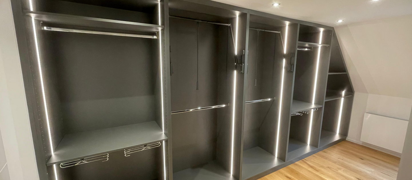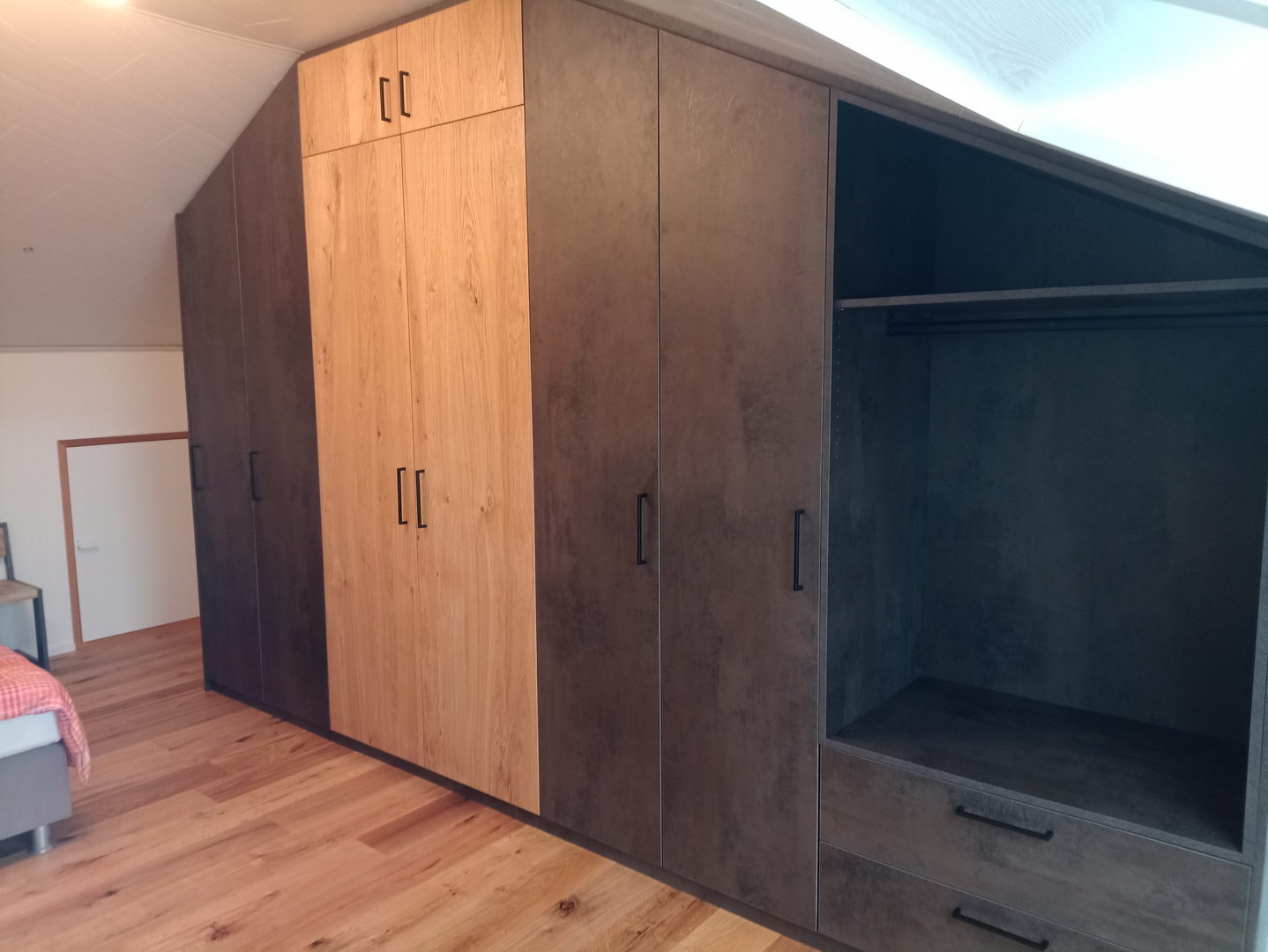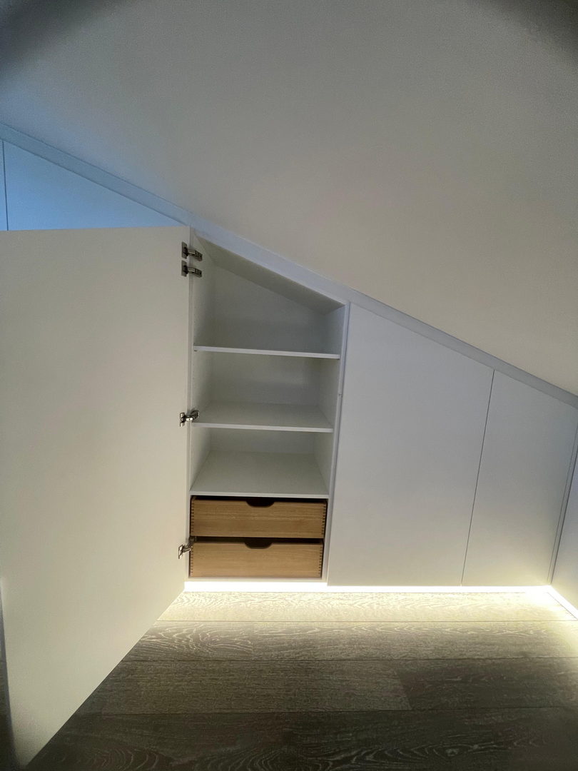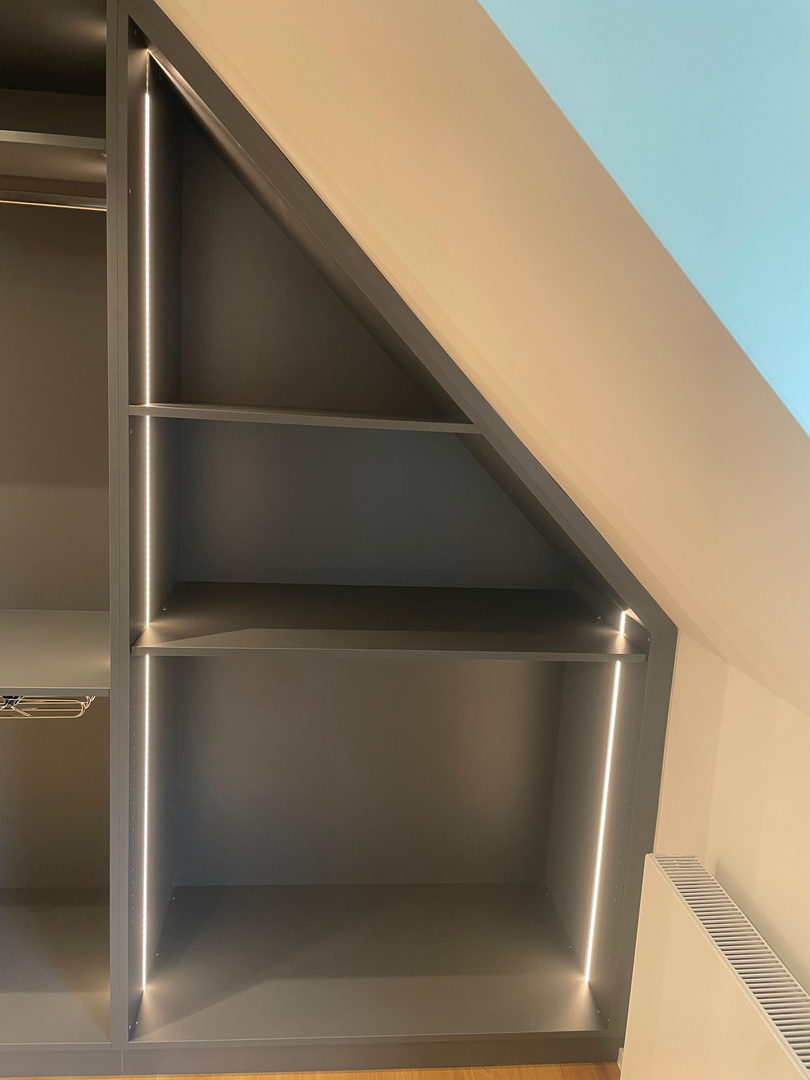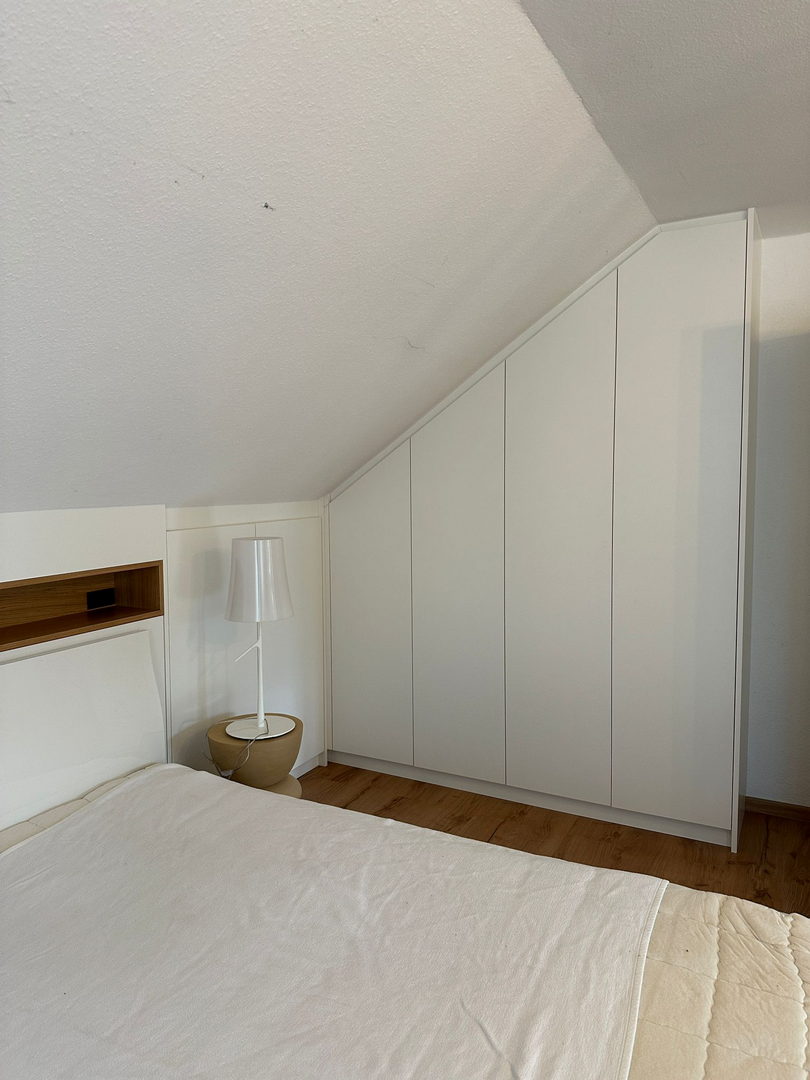 Unsere Dachschrägenschränke nach Maß bieten vielfältige Nutzungsmöglichkeiten: als Kleiderschrank mit Kleiderstangen und Schubladen, als Stauraumlösung für Schuhe und Koffer oder als geschlossener Einbauschrank für Akten, Bücher und Haushaltsgeräte. Auch Kombinationen aus offenen Regalen und geschlossenen Fronten sind möglich – exakt abgestimmt auf Ihre Bedürfnisse.