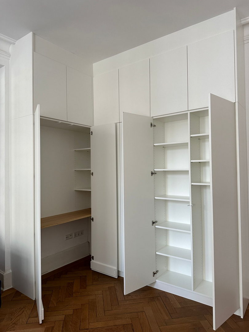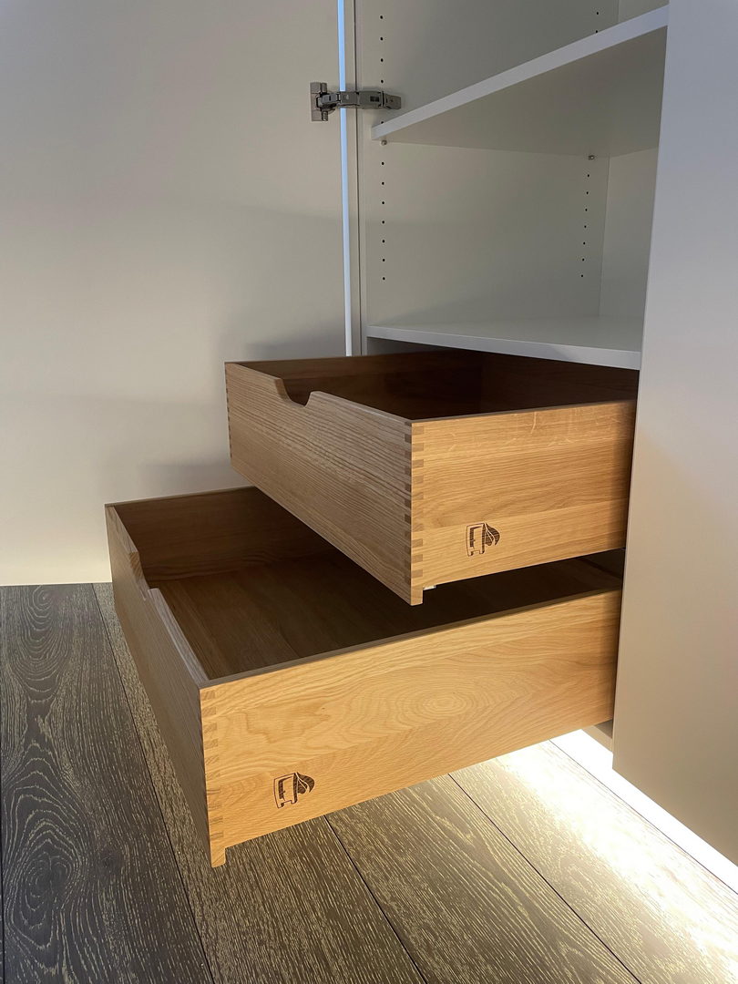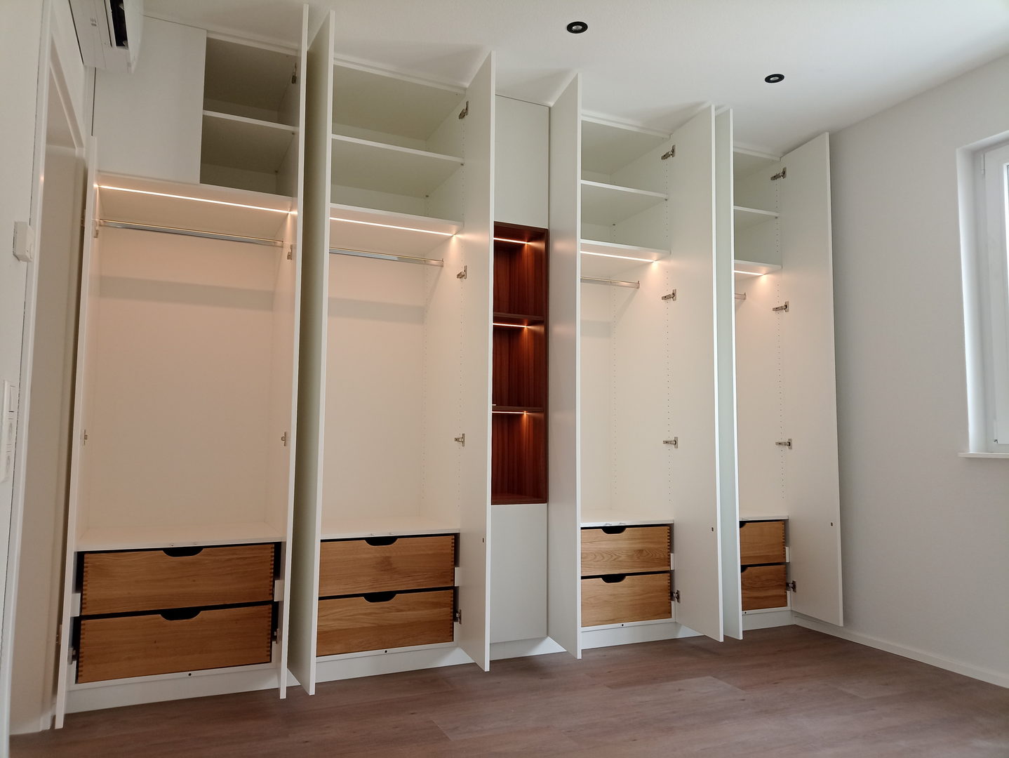 Jede Lösung entsteht in enger Zusammenarbeit mit Ihnen: Sie teilen uns Ihre Wünsche mit, und wir zeigen Ihnen die passenden Möglichkeiten – von klassischen Schrankformen bis hin zu offenen oder integrierten Systemen.